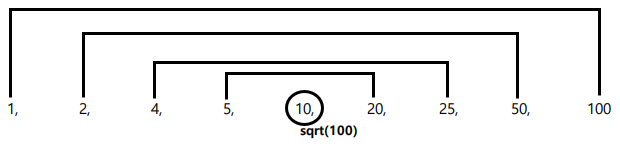 - 100의 약수는 1, 2, 4, 5, 10, 20, 25, 50, 100이 있으며, 10(100의 제곱근)을 기준으로 서로 대칭됨을 알 수 있다.