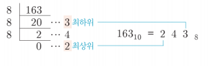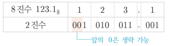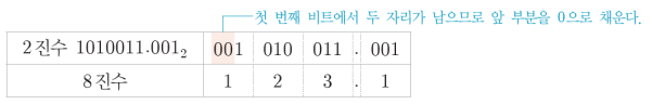 - 한 자리의 8진수를 2진수로 표현하려면 최대 3비트가 필요하다.