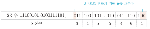 - 반대로 2진수를 8진수로 변환할 때는 2진수를 소수점 기준으로 3비트씩 한 단위로 묶고, 각 단위를 10진수로 표현하여 8진수로 변환한다.