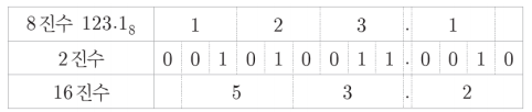 - 그러므로 8진수를 구성하는 각 자리의 숫자를 3비트로 구성된 2진수로 표현하면 8진수를 2진수로 변환할 수 있다.