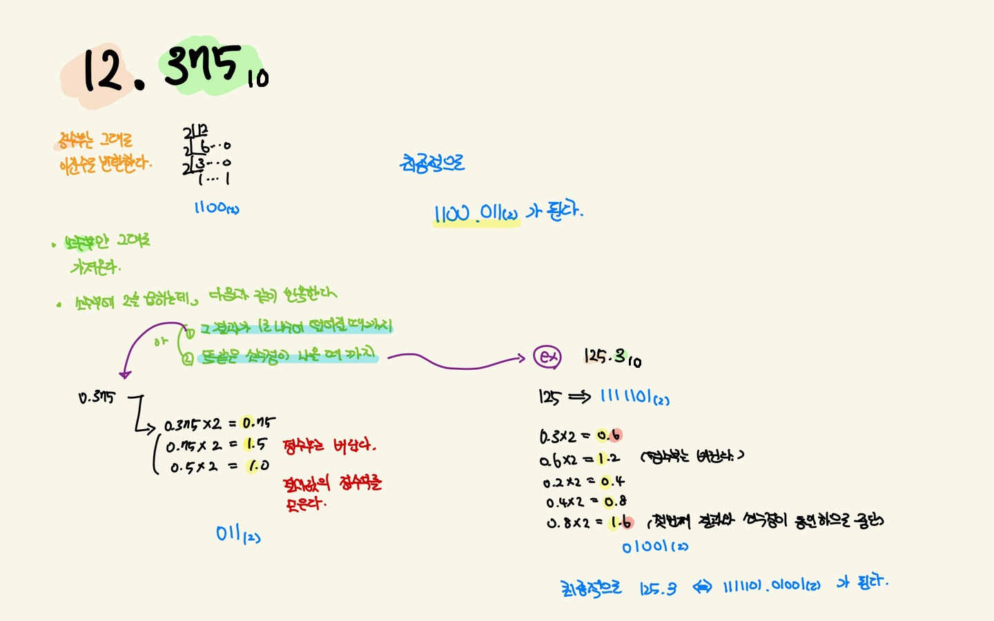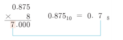 - 소수부가 0이 되지 않을 때가 있는데, 이때는 똑같은 소수부가 나올 때까지 변환하려는 기수를 곱하면서 각 단계마다 나오는 정수부의 값을 나열한다.