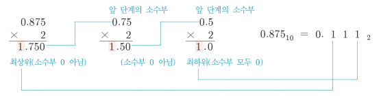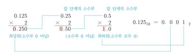 - 가장 먼저 얻은 정숫값은 변환된 진수 표현의 소수점에 가장 가까운 자리(소수부 최상위 자리)에 위치