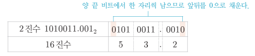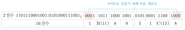 - 반대로 2진수를 16진수로 변환할 때는 2진수를 소수점 기준으로 4비트씩 한 단위로 묶고, 각 단위를 10진수로 표현하여 16진수로 변환한다.