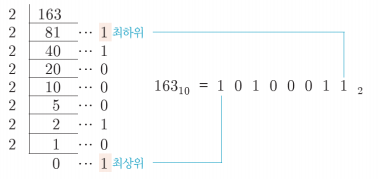 - 가장 나중에 얻은 나머지는 변환된 진수의 가장 왼쪽 자리(정수부 최상위 자리)에 위치