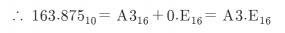 $A3.E_{16} = A × 16^{1} + 3 × 16^{0} + E × 16^{-1} = 10 × 16^{1} + 3 × 1 + 14 × 16^{-1} = 163.875_{10}$