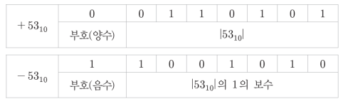 - 최상위 비트는 부호를 의미하므로 양수 `+53_{10}` 에 대해서는 0, 음수 `-53_{10}` 에 대해서는 1로 표시한다.