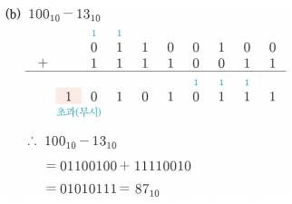 - 부호-절댓값 표현과 부호-2의 보수 표현을 이용한 연산에서 발생하는 초과는 무시한다.