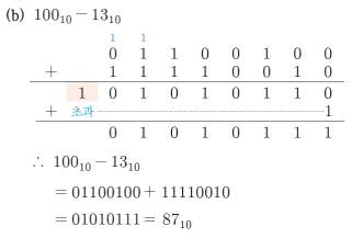 - 부호-1의 보수 표현 : 발생한 초과를 1차적으로 구한 결과에 더한다.