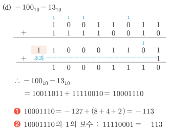 $= -127 + (0 + 32 + 0 + 8 + 4 + 2 + 0) = -81$ - ② `10101110` 에 대한 1의 보수 : `11010001`