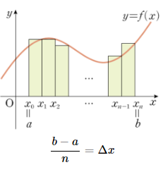 - 그리고 소구간의 길이를 $\displaystyle \frac{b-a}{n} = Δx$ 라 하면, 각 분할 점 `x_{k}` 는 다음과 같다.