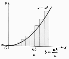 $\displaystyle \int^{b}_{0}x^{2}dx = \lim_{n→∞} \sum^{n}_{k=1} f(x_{k})Δx = \lim_{n→∞} \sum^{n}_{k=1} (\frac{kb}{n})^{2}(\frac{b}{n}) = \lim_{n→∞} \frac{b^{3}}{n^{3}}\sum^{n}_{k=1}k^{2} = \lim_{n→∞} \frac{b^{3}}{n^{3}} · \frac{n(n+1)(2n+1)}{6} = \frac{b^{3}}{3}$