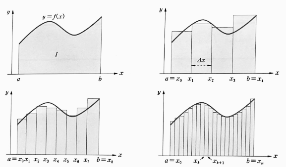 $$I = \lim_{n→∞} S_{n} = \lim_{n→∞} \sum_{k=1}^{n}f(x_{k})Δx = \int_{a}^{b} f(x)dx$$