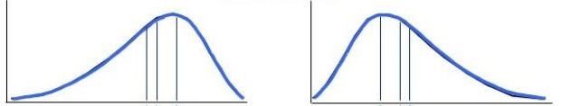 - 중앙값은 아래 그림과 같이 자료 집단의 분포 모양이 어느 한쪽 방향으로 치우치고, 다른 쪽 방향으로 긴 꼬리 모양을 갖는 경우의 대푯값으로 많이 사용한다.