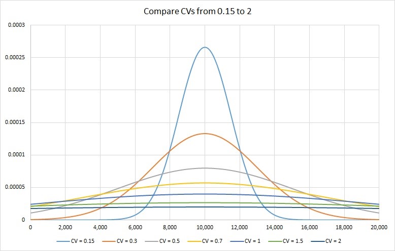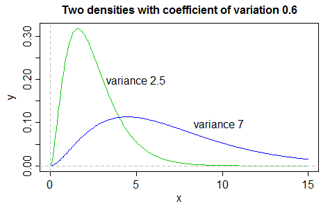 그러므로 절대 수치에 의하면 표본 A의 분포가 표본 B에 비해 폭넓게 나타나지만($s^{2}_{A} > s^{2}_{B}$ 이므로), 상대적으로 비교하면 표본 B의 분포가 표본 A에 비해 폭넓게 나타난다. ($C.V_{A} < C.V_{B}$ 이므로)