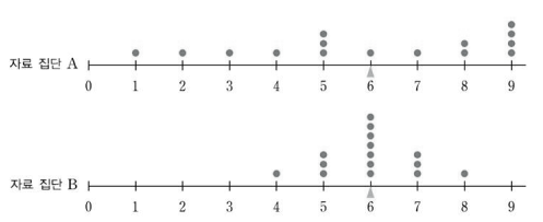 - 두 자료 집단의 대푯값인 평균이 동일하더라도, 두 자료 집단의 특성이 동일한 것은 아니다.