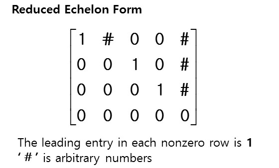 ② 기약 행 사다리꼴 행렬(Reduced Row Echelon Form Matrix) : 행 사다리꼴 행렬에서 각 행의 0이 아닌 첫 번째 원소 1을 포함한 열의 나머지 원소가 모두 0인 행렬