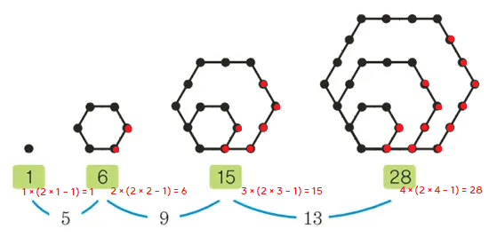 - 육각형 모양으로 어떤 점을 놓았을 때, 육각형을 이루기 위해 사용된 점의 수