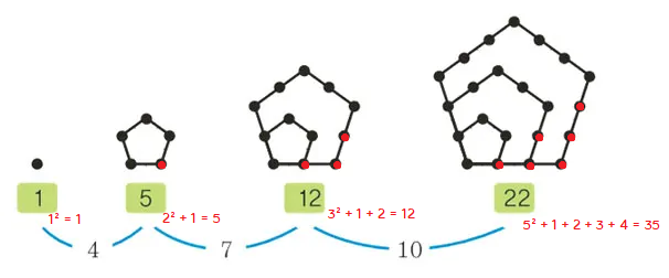 - 오각형 모양으로 어떤 점을 놓았을 때, 오각형을 이루기 위해 사용된 점의 수
