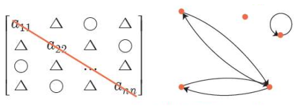 - 비반사 관계의 경우, 다음 그림처럼 관계 행렬의 주대각 원소는 모두 0이고, 방향 그래프의 모든 꼭짓점은 루프를 갖지 않는다.