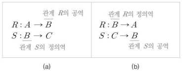 - 여기서 연결 고리인 자료 집합은 합성에 사용되는 두 관계 중 한 관계에서는 정의역이고, 다른 관계에서는 공역이어야 한다.