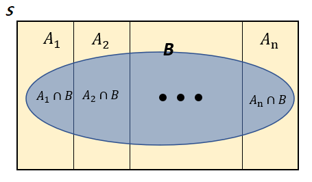 - 확률이 0이 아닌 사건들 $A_{1}, A_{2}, \cdots, A_{n}$ 이 표본 공간 `S` 의 분할이라 하면, 다음을 만족한다.