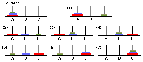 세 개의 장대가 있고 첫 번째 장대에는 반경이 서로 다른 n개의 원판이 쌓여 있다. 각 원판은 반경이 큰 순서대로 쌓여있다. 이제 수도승들이 다음 규칙에 따라 첫 번째 장대에서 세 번째 장대로