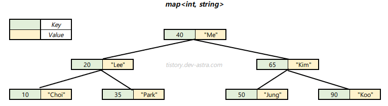 - pair 객체 형태로 키(Key)와 값(Value)이 저장된다.