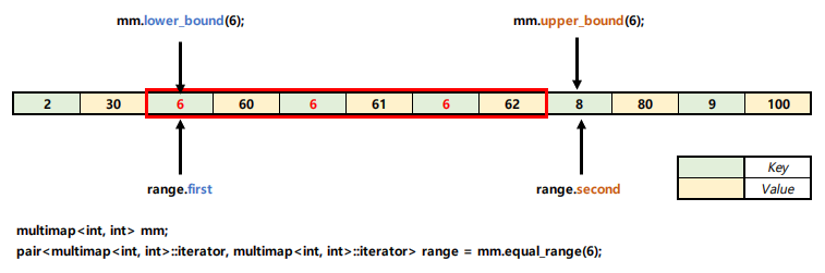 first는 키(Key) 값에 해당하는 원소의 첫번째 반복자를 반환한다. (lower_bound) - pair 객체의 second는 키(Key) 값에 해당하는 원소의 마지막 원소의 다음 반복자를 반환한다. (upper_bound)
