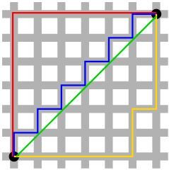 - 미국 뉴욕의 맨해튼처럼 바둑판 격자 모양으로 도로가 나있는 상황에서, 한 지점에서 다른 위치로 이동하기 위해서 필요한 거리