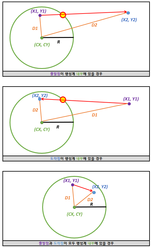 if (D2 < R && D1 > R) { // 도착점이 행성계 안에 있고, 출발점이 행성계 밖에 있는 경우