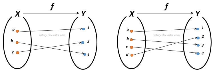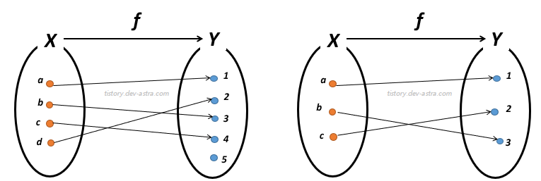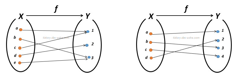 - 그래서 전단사 함수는 정의역, 공역, 치역의 원소 개수가 모두 같다.