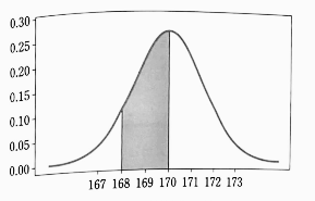 - 특히, 조사한 남자들 중에서 임의로 선정한 사람의 키가 168cm 이상 170cm 이하일 확률을 구하면, 이 확률은 색칠한 부분의 넓이다.