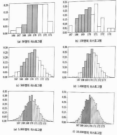 - 이 때, 조사한 성인 남자의 수를 늘리면, 히스토그램은 아래와 같이 계급 간격은 줄어들고 계급의 수는 늘어난다.