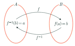 전단사 함수 $f : A \rightarrow B$ 에 대해 $B \rightarrow A$ 로 대응되는 관계 $a \in A, \; b \in B$ 에 대해 $f(a) = b$ 일 때, $f^{-1}(b) = a$ ($f(a)$ : 가역 함수, $f^{-1}(b)$ : 역함수)