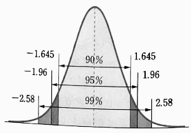 | $$P(|Z| < 1.645) = 0.9, \; P(|Z| < 1.96) = 0.95, \; P(|Z| < 2.58) = 0.99$$ |