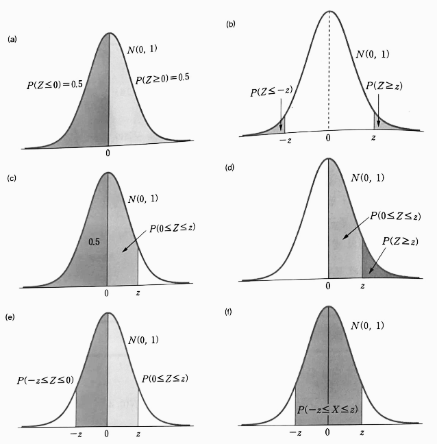 | (1) $P(Z \le 0) = P(Z \ge 0) = 0.5$ (2) $P(Z \le -z) = P(Z \ge z)$ (3) $P(0 \le Z \le z) = P(Z \le z) - 0.5$ (4) $P(Z \ge z) = 0.5 - P(0 \le Z \le z)$ (5) $P(-z \le Z \le 0) = P(0 \le Z \le z)$ (6) $P(-z \le Z \le z) = 2P(0 \le Z \le z) = 2P(Z \le z) - 1$ |