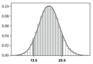 - 따라서 이항 분포에서 확률 $P(14 \le X \le 25)$ 는 `13.5` 부터 `25.5` 까지 밑변의 길이가 1인 직사각형들의 넓이의 합이다.