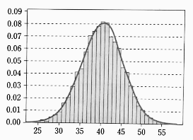 - 자연 현상이나 사회 현상에서 얻게 되는 대부분의 자료에 대한 히스토그램은 자료의 수가 클수록 계급 간격이 좁아지고, 아래와 같이 좌우 대칭인 종 모양의 곡선에 가까워진다.