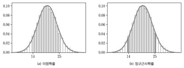 - 그러나 이항 분포의 정규 근사에 의한 확률은 (b)와 같이 $14 \le x \le 25$ 범위에서 정규 곡선으로 둘러싸인 부분의 넓이이다.