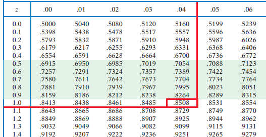 | ① `z` 열에서 소수점 첫째 자리 숫자 `1.0` 을 선택한다. ② `z` 행에서 소수점 둘째 자리 숫자 `0.04` 를 선택한다. ③ `z` 열이 `1.0` 인 행과 `z` 행이 `0.04` 인 열이 만나는 위치의 수 `0.8508` 을 선택한다. ④ $P(Z \le 1.04) = 0.8508$ 이다. |
