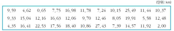 | $$μ = \frac{1}{33} \sum_{i=1}^{33} x_{i} = \frac{402.88}{33} = 12.21(km)$$ |