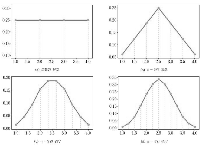 - 또한 모집단 분포가 이산 확률 분포로 균등하게 나타나더라도 표본 평균의 표본 분포는 아래와 같이 `n` 이 커질수록 종 모양으로 변하는 것을 알 수 있다.