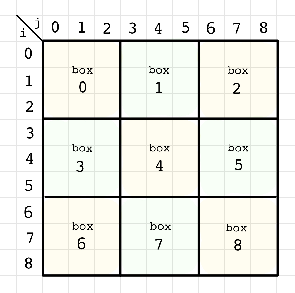 - 스도쿠는 9 × 9 크기 2차원 배열로 이루어져 있으므로, 81(= 9 × 9)개의 인자들이 행 번호와 열 번호로 분리되어 배열에 입력될 것이다.