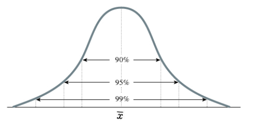 - 90% 신뢰 구간 : $\displaystyle \overline{x} - 1.645 \frac{σ}{\sqrt{n}} \le μ \le \overline{x} + 1.645 \frac{σ}{\sqrt{n}}$