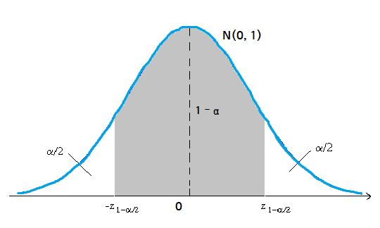 - 그러면 양쪽 꼬리 확률이 각각 `α / 2` 인 백분위수 $-z_{\frac{α}{2}}$ 와 $z_{\frac{α}{2}}$ 에 대해 다음이 성립한다.
