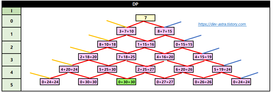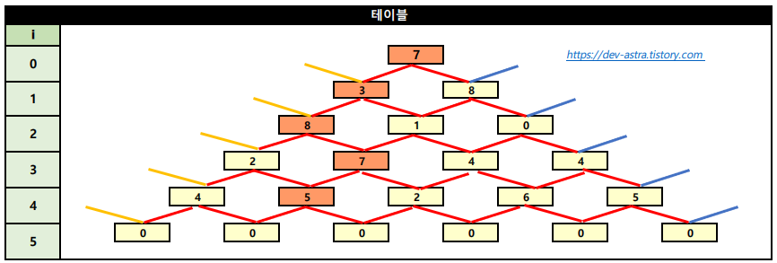 - 이 문제를 DP를 이용하여 해결하려면 밑으로 내려 가면서 DP 테이블을 업데이트 해나가야 한다.