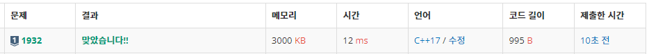 - 첫 번째 위치(@j == 0@)에 있는 가중치 : @dp[i][j] += dp[i - 1][0];@