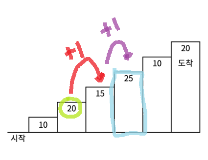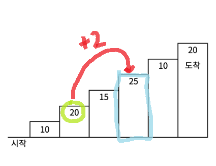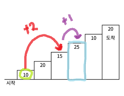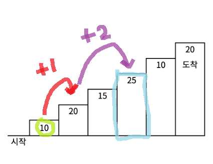 - 첫 번째 계단과 세 번째 계단을 밟는 경우(@stairs[1] + stairs[3]@) : 10 + 15 = @25@ [1칸 + 2칸]