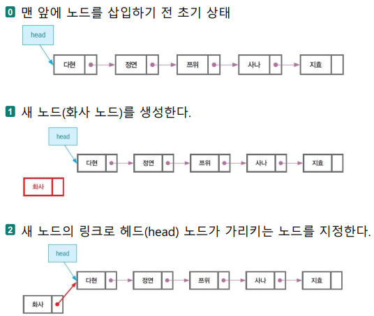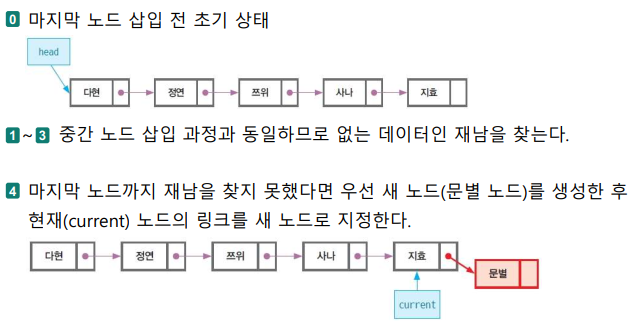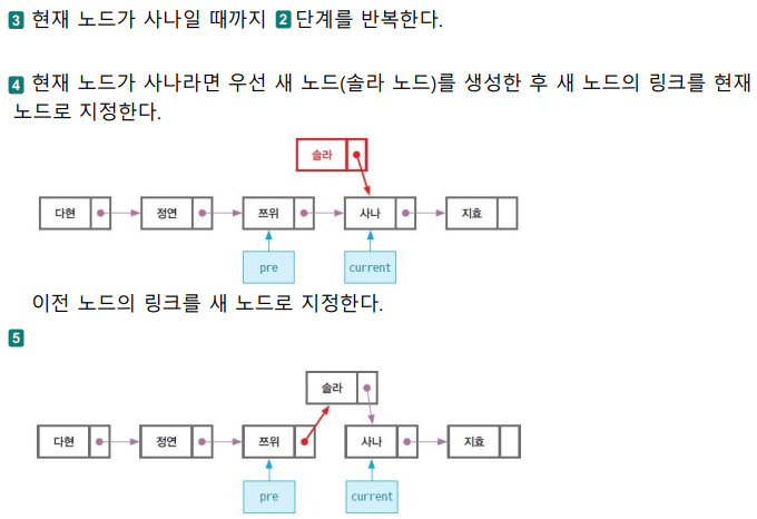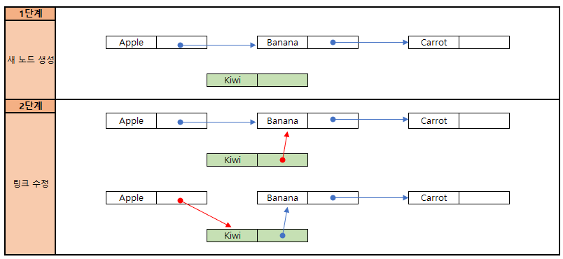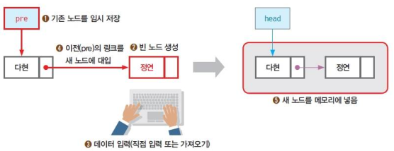 - 새 노드를 기준 노드의 링크에 저장하기 전에 기존 노드를 잠시 저장한 후 생성해야 한다.