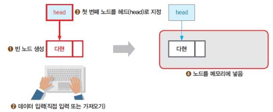 - 헤드(head) : 첫 번째 노드를 가리킨다.
